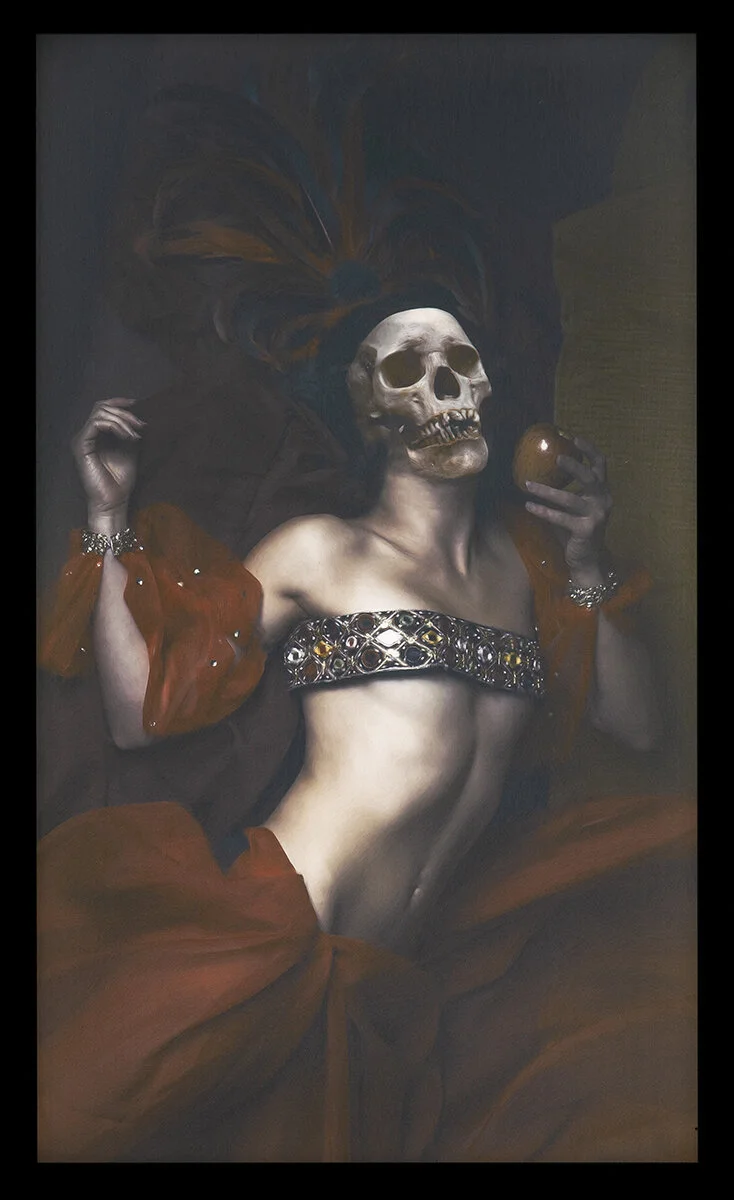 At first thought, I thought this painting to be linked to Santa Muerte of Mexico but the topic of this conversation kinda goes against the symbolism of La Muerte. Maybe this is the sign of the times? The well meaning of Saint Death eroded into an ugliness of human desires of constant neediness, like a drug, a poisoned apple.